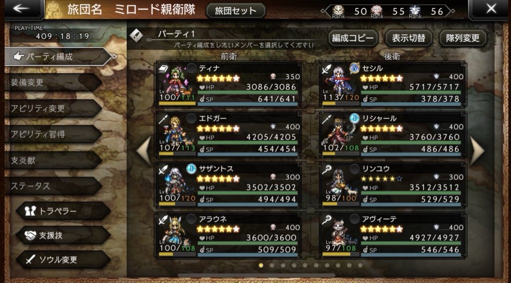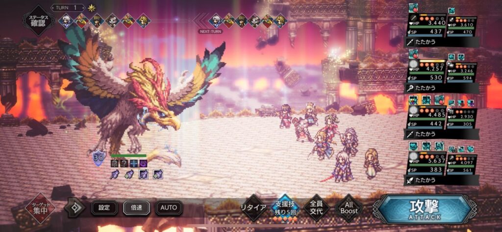 オクトラバトルの基本と言えばそうなんですけど、サザントス戦では普通にBP削られまくるので、SP回復も兼ねて前後衛の交代は意識してやるのが良さげ。